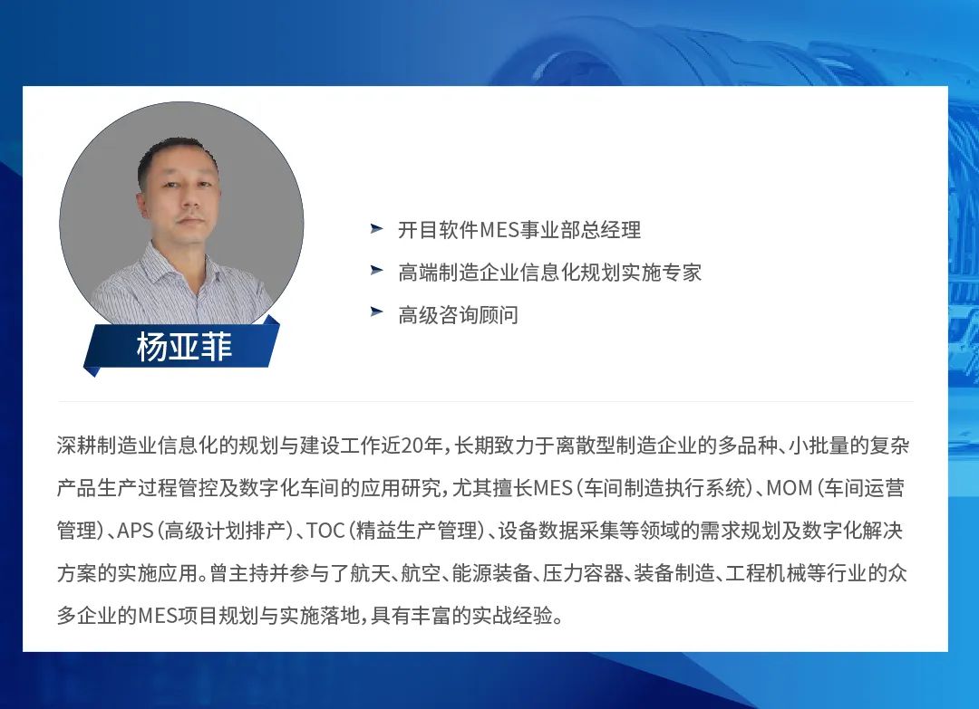 本期研讨会特邀英国正版365官方网站MES事业部总经理杨亚菲、四机赛瓦生产总监黄志军、广日电梯信息中心副主任付东军做客开目线上直播间,专家将全程在线答疑,与来宾深入探讨开目制造执行系统MES的优势特点与实际落地应用。