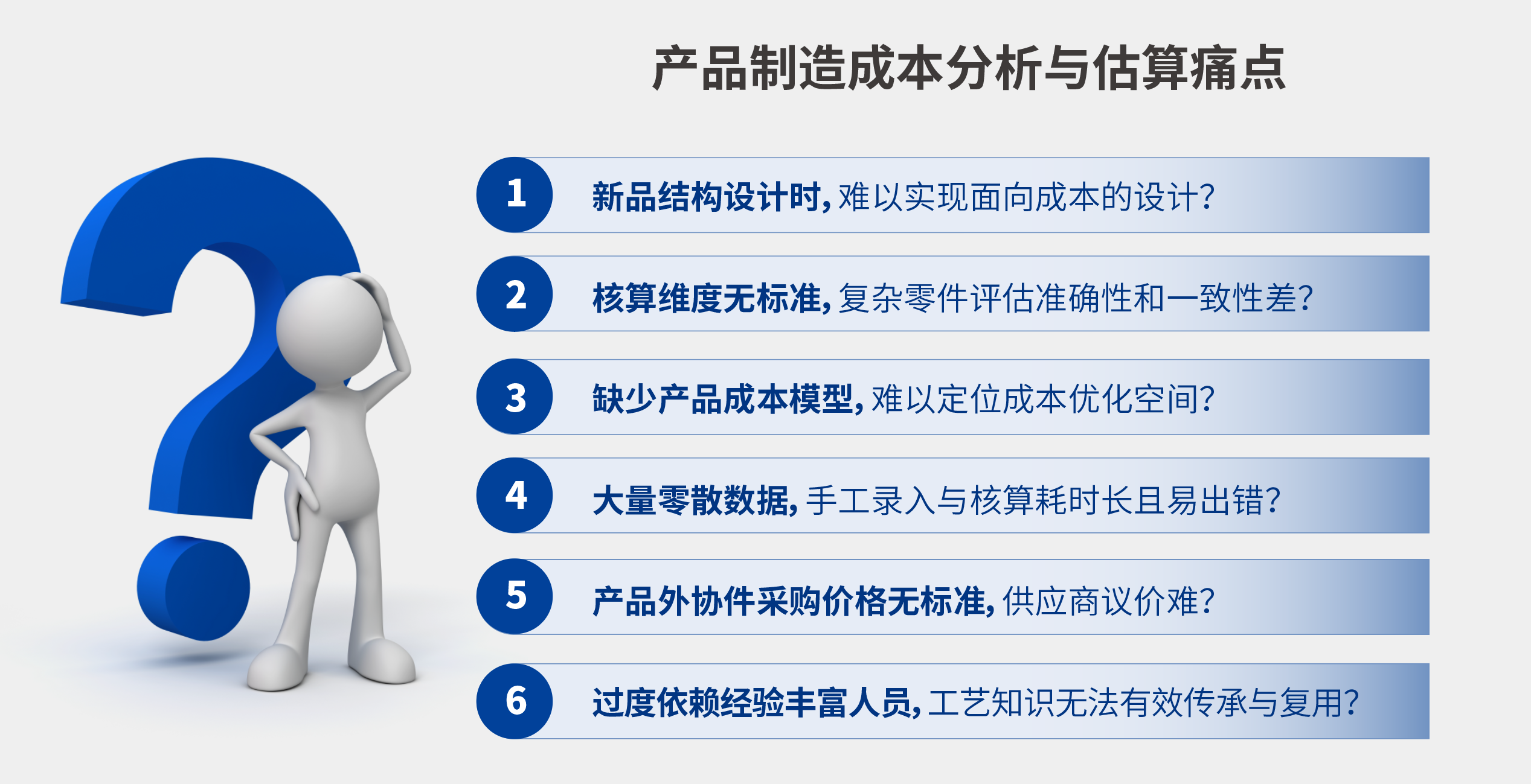 随着科技的不断进步和全球化市场的发展,推进数字化转型、服务产品升级、提高经营效率、降低生产成本成为装备制造企业赢得竞争的关键。而产品的成本贯穿整个产品生命周期,研究表明,70%-80%的成本在研发阶段就已经确定,因此装备制造企业普遍寻求应用数字化手段来降低产品成本,从而提高产品的竞争力。但企业在产品的成本控制和降本方法上,常常会面临以下问题: