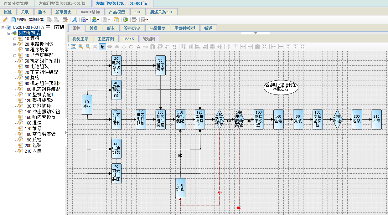 通过在工序流程图中增加回转线、标注图形、判定等图形,能清晰和直观的表达工序间的流转。开目eCOL PLM 8.0新版本支持电装、机装、装调等多专业的协同工作,支持自定义串行或并行的装配过程,以及自动生成和输出工序流程图,用于生产车间的工作指导或展示等;支持在任意地方添加批注,醒目且直观地体现工序流程图的需注意事项;支持回退线用于满足装调等专业的调试需求,清晰地表达调试工艺过程中根据检测结果来决定工序走向的情况。