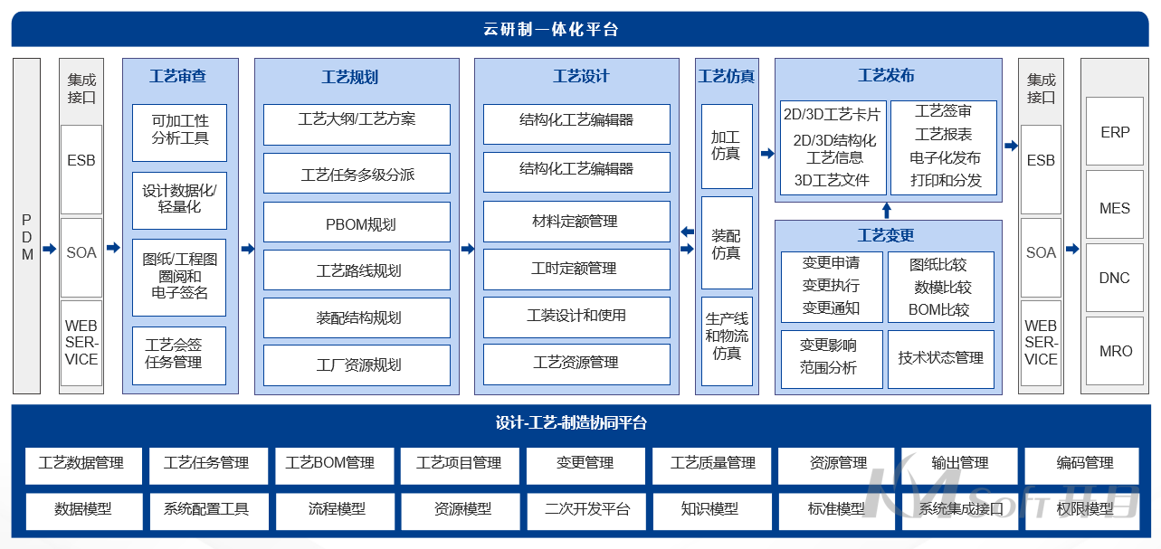 与PLM/MES/ERP以及设计和仿真工具的集成管理,承接上游设计数据,强化工艺桥梁作用,为下游生产提供业务所需的各类工艺要素,保证工艺数据的一致性、及时性及完整性;