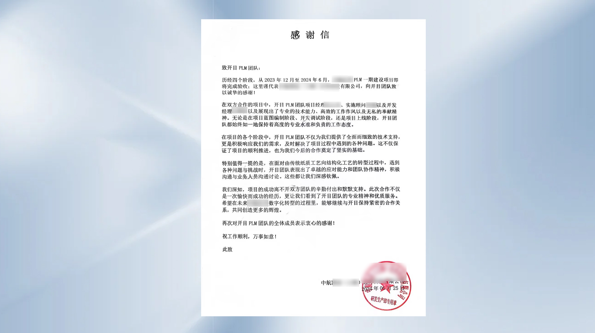 项目验收后,中航工业集团某公司给PLM项目组发来感谢信,其中提到:“在面对由传统纸质工艺向结构化工艺的转型过程中,遇到各种问题与挑战时,开目团队表现出了卓越的应对能力和团队协作精神.......希望在未来数字化转型的过程里,能够继续与开目保持紧密的合作关系,共同创造更多的辉煌。