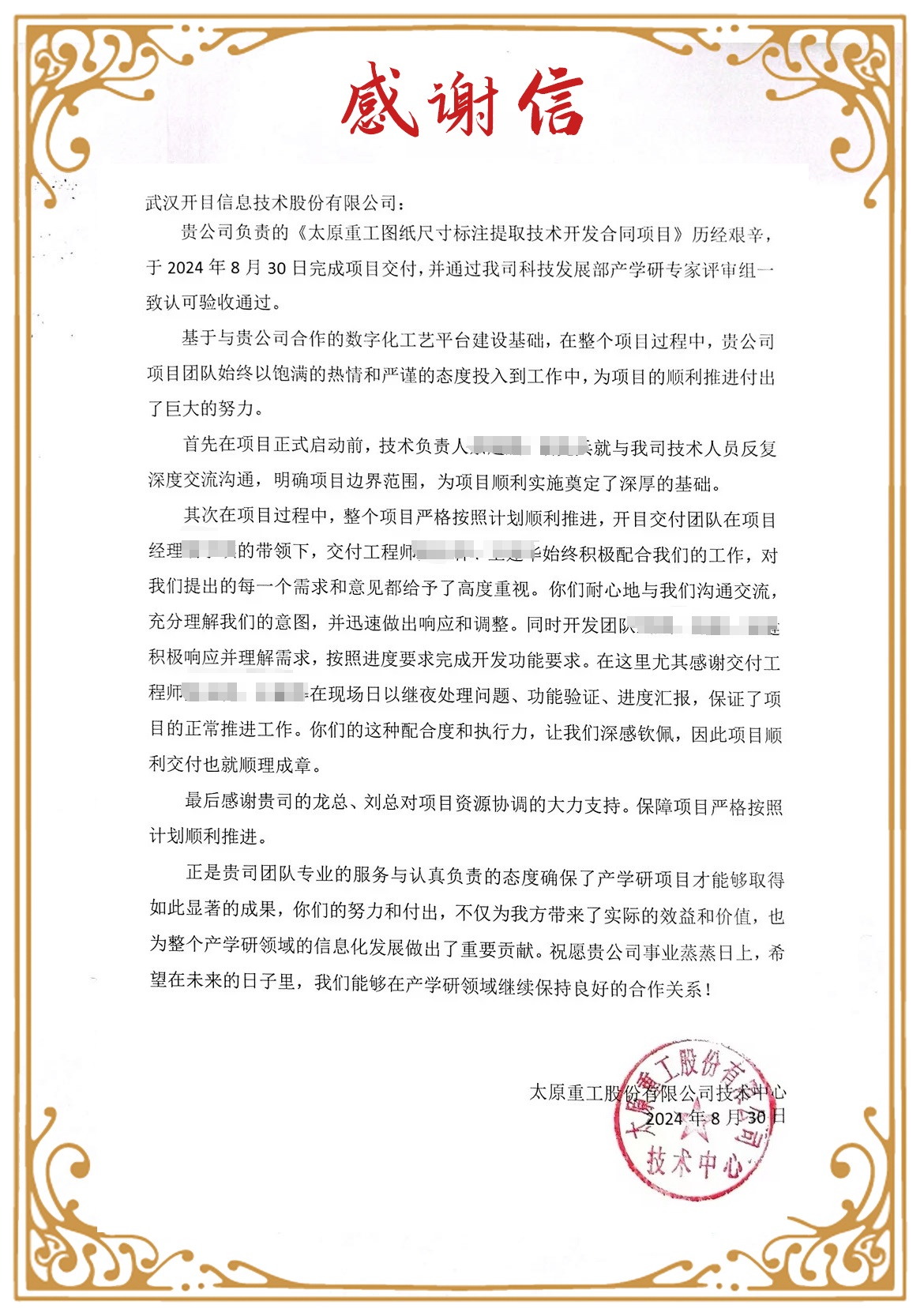 近日,太重集团图纸尺寸标注提取技术开发项目顺利验收,项目组仅用3个半月便完成了企业尺寸标注提取系统的技术开发,帮助企业提高了企业设计效率,缩短工艺文件及工艺技术准备周期。为此,太重集团向英国正版365官方网站发来感谢信,字里行间充满了对开目提供的工业软件技术、产品、方案与服务的肯定,同时对未来的合作前景进行了新的展望。